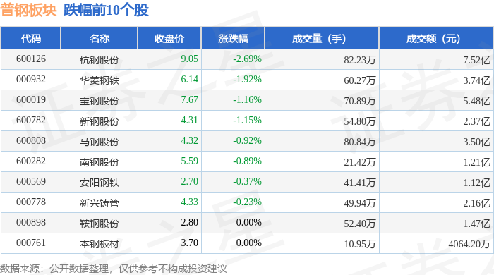 证券之星音讯,11月14日普钢板块较上一交易日跌落0.35%,杭钢股份领跌。当日上证指数报收于3990.49,跌落0.97%。深证成指报收于13216.03,跌落1.93%。普钢板块个股涨跌见下表: