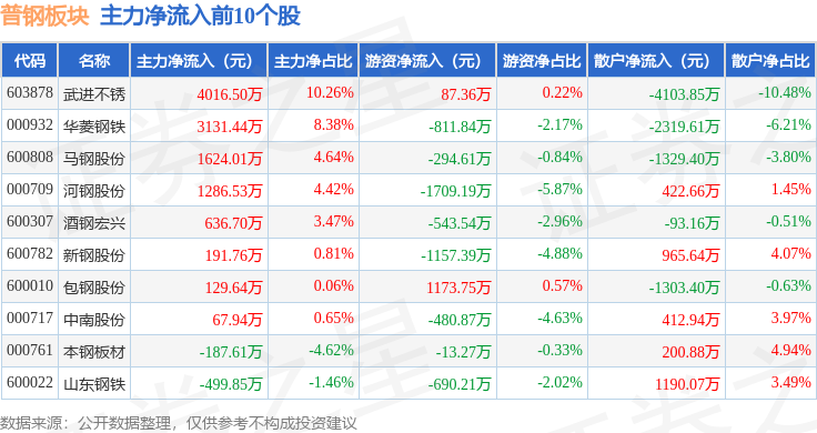 从资金流向上来看,当日普钢板块主力资金净流出1.87亿元,游资资金净流入310.85万元,散户资金净流入1.84亿元。普钢板块个股资金流向见下表: